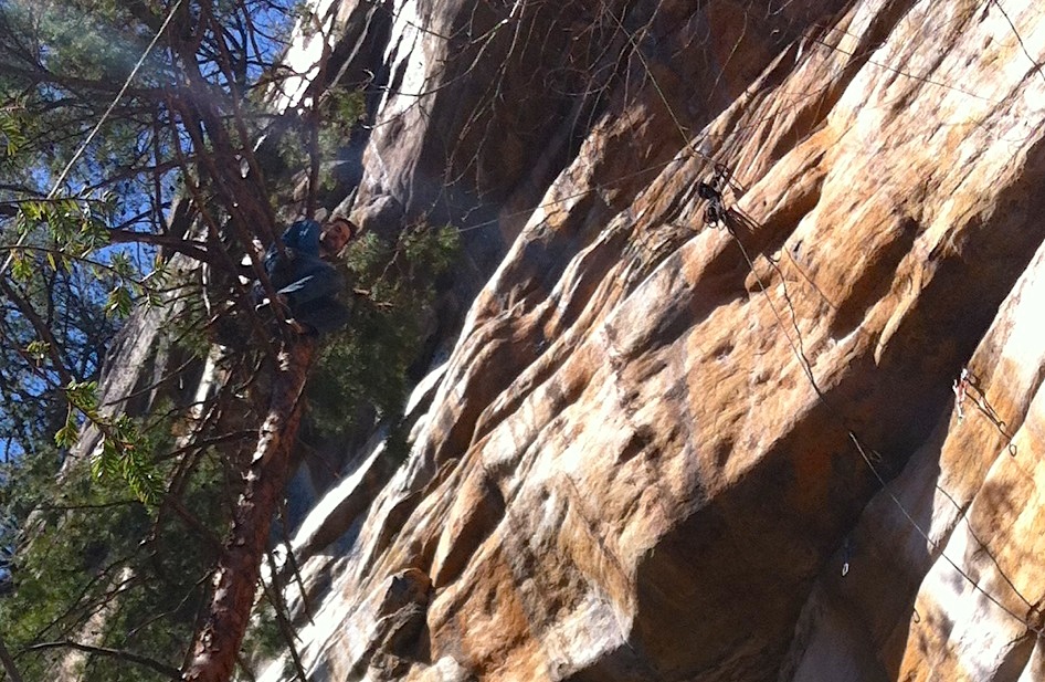 Several days into working the route, I has another cool realization. About 15ft behind the crux is a pine tree with a bunch of broken limbs. Because the route is so overhanging, it's possible to swing from the bottom of the crux to the tree. It occurred to me that I could do this while working the problem to avoid hanging in my harness. I've only done this once and it seemed better than hanging in the harness but still not as restful as being on the ground. Was fun for the novelty of it and if I had realized this earlier when I was working the moves more, it probably would have been more useful. Here's a photo of me resting in the tree.